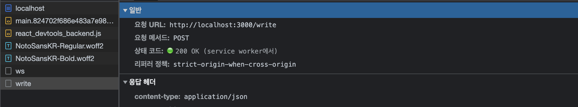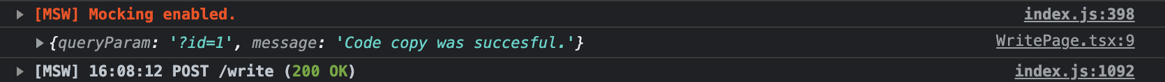 service.post("/write", { code: "123" }).then((result) => { console.log(result); });위와 같이 write를 호출하게 되면 개발환경에서 실행을 하게 되면 msw에 설정해둔 write리졸버를 타게 되고 다음과 같은 결과를 얻을 수 있습니다.