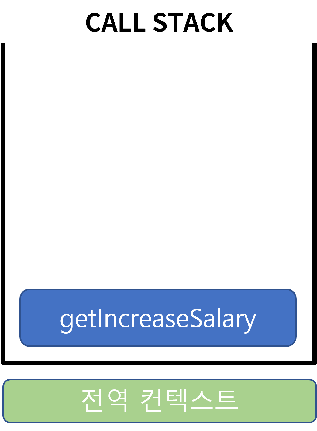 total : (2)그 다음 getIncreaseSalary() 함수를 호출하면 실행컨텍스트를 만들고 지역메모리에 매개변수 10이라는 값이 할당됩니다. 그 후 total을 만들고 salary * ratio 값을 할당 받아야 됩니다. ratio값은 함수의 메모리에 없기 때문에 콜스택의 바닥인, 즉 상위 컨텍스트인 전역 컨텍스트를 찾아 봅니다.