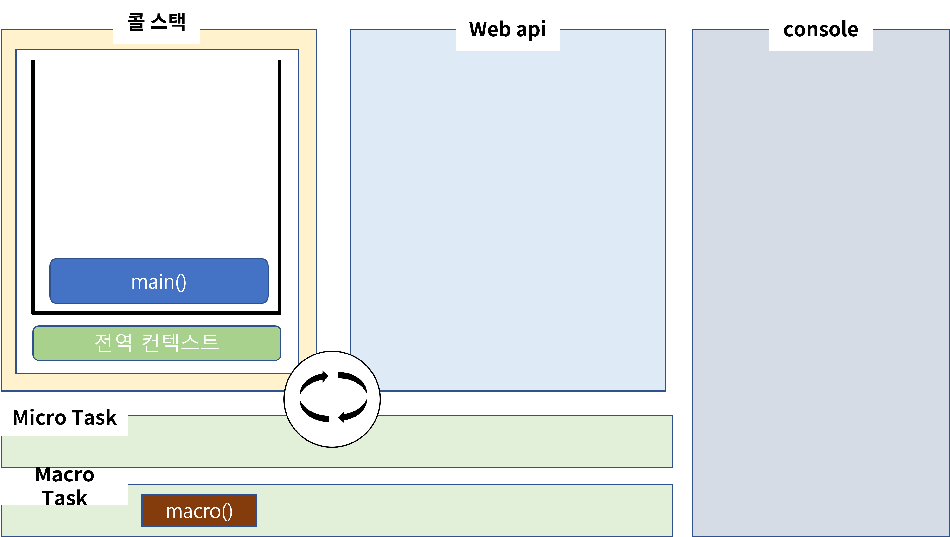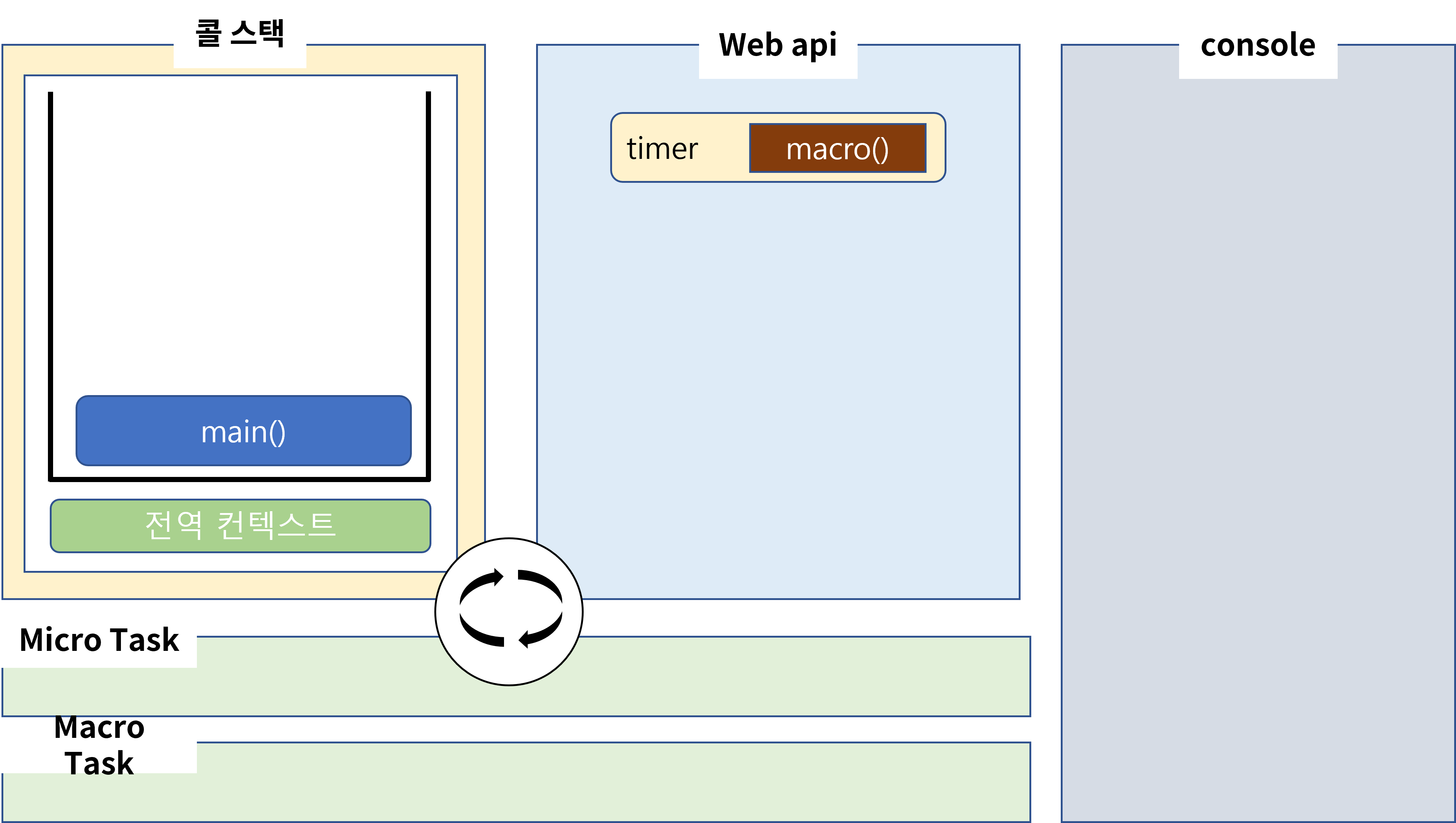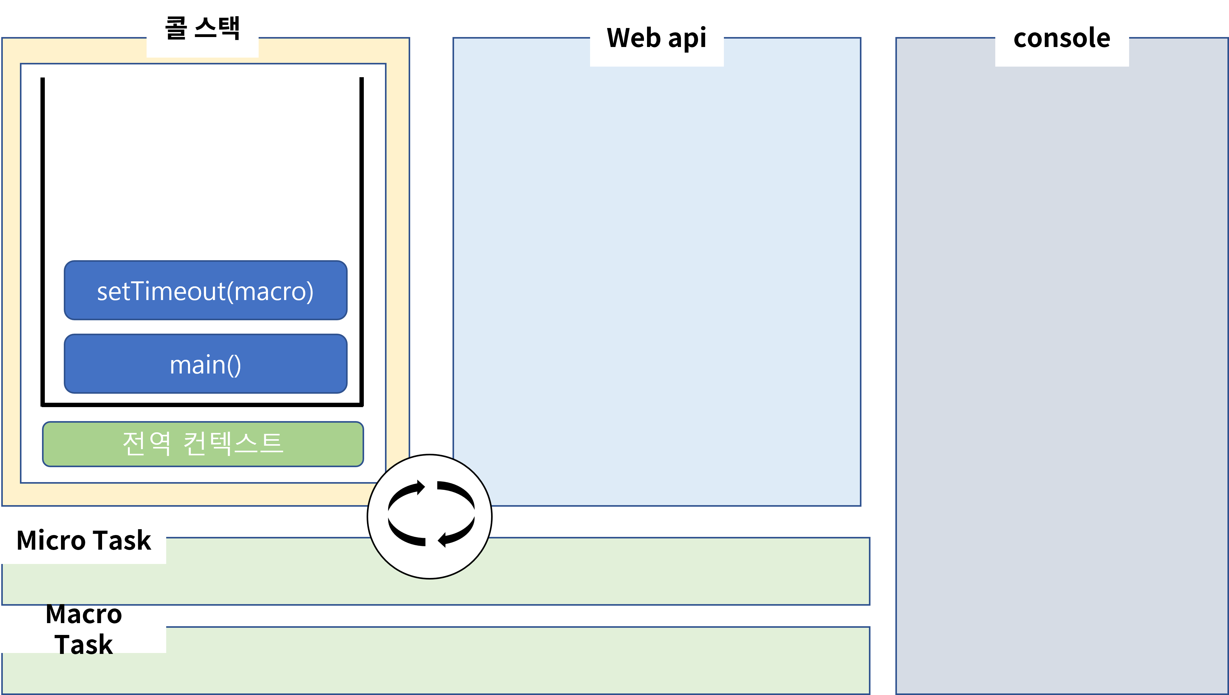 그럼 webAPI에서 타이머가 시작되고 콜 스택의 setTimeout이 pop이 될 것입니다. 그 후, 해당 timer는 0초짜리기 때문에 바로 MacroTask에 콜백 함수인 macro가 등록이 될 것입니다. 하지만 콜 스택에 아직 main이 있으니 이벤트 루프가 콜 스택에 push는 못합니다. 계속 진행해 보겠습니다.