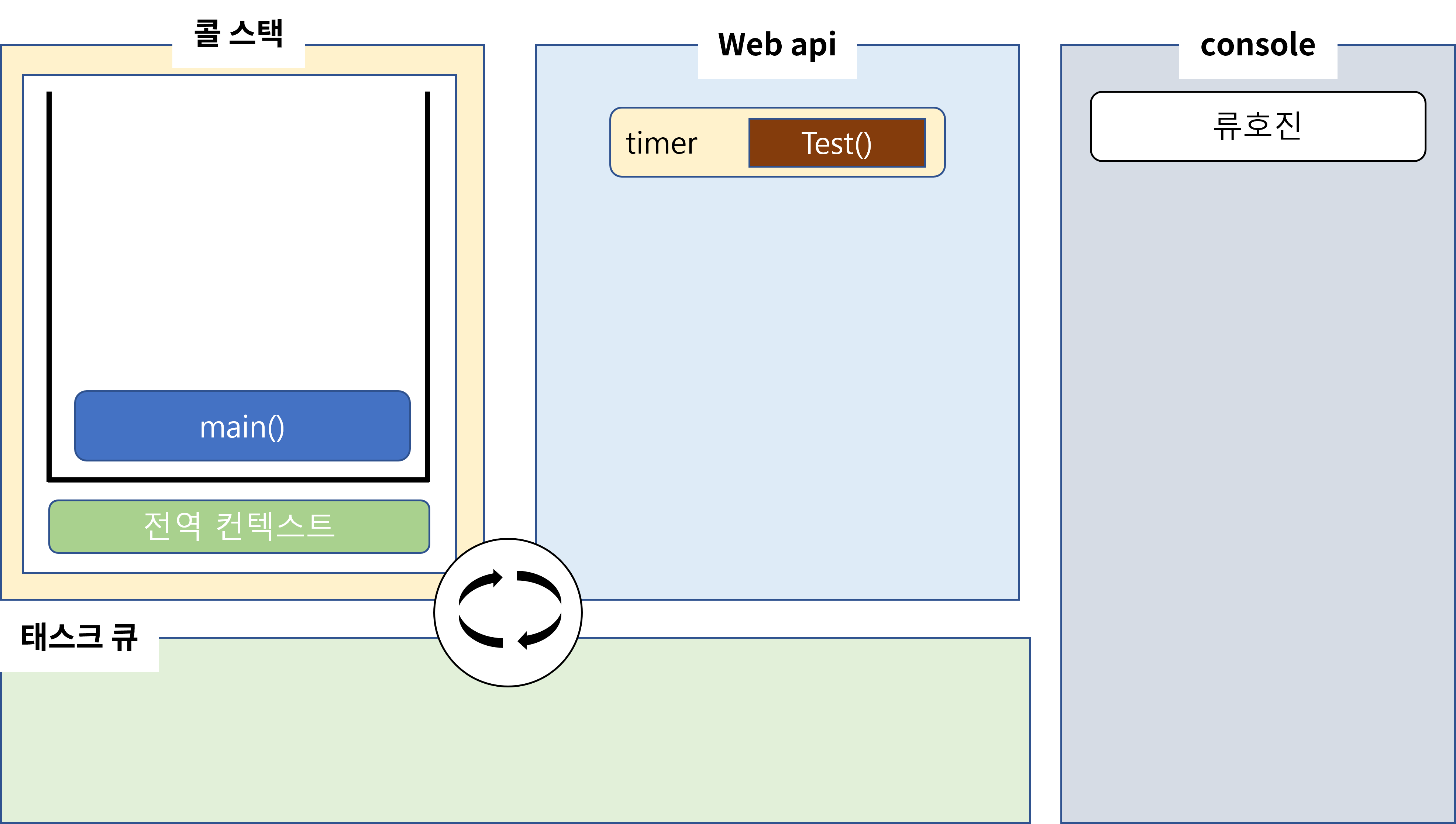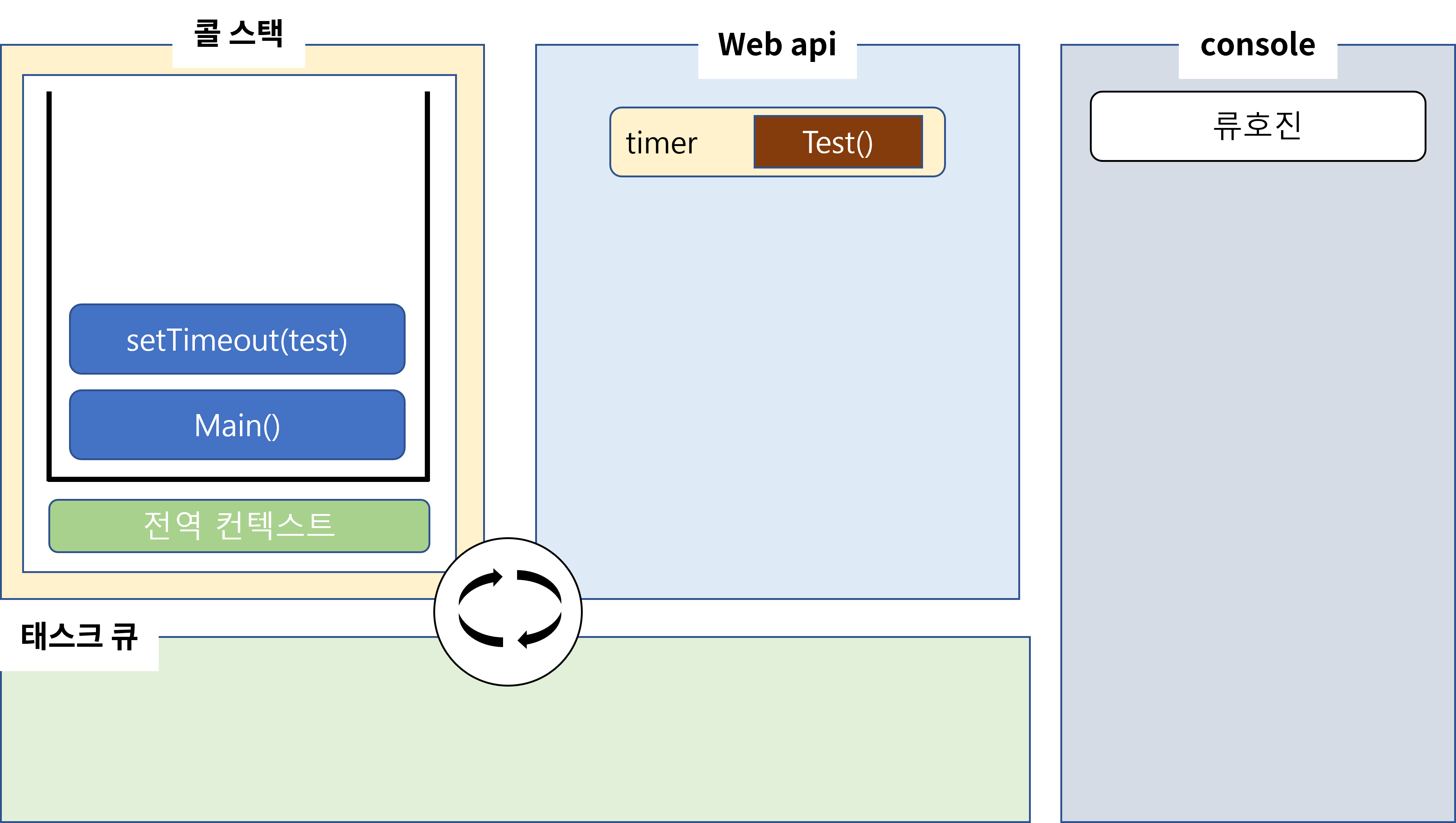 timer뿐만 아니라 모든 webAPI는 작동이 완료되면 콜백을 테스크큐에 넣습니다. 그럼 위에서 설명하였듯이 이벤트 루프는 스택과 테스트큐를 감시하고 있다가 예시처럼 스택에 비어있다면 스택에 test를 쌓습니다.
