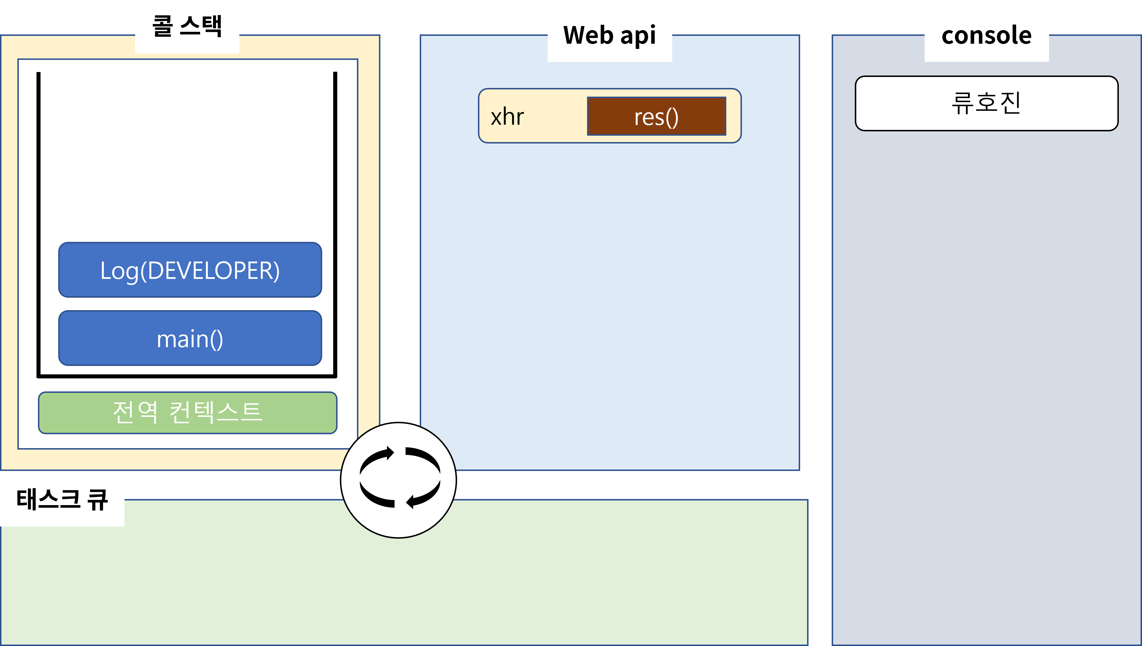 function main() { console.log("류호진"); $.get("url",function res(data){ console.log(data); }); // (1) console.log("DEVELOPER"); }
