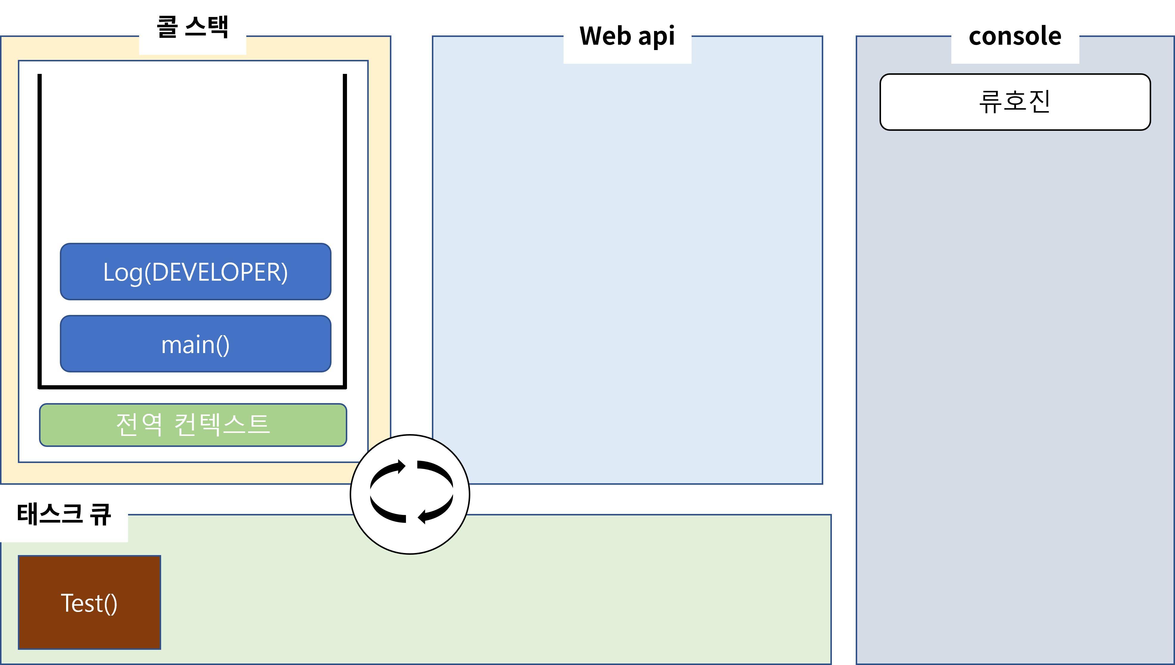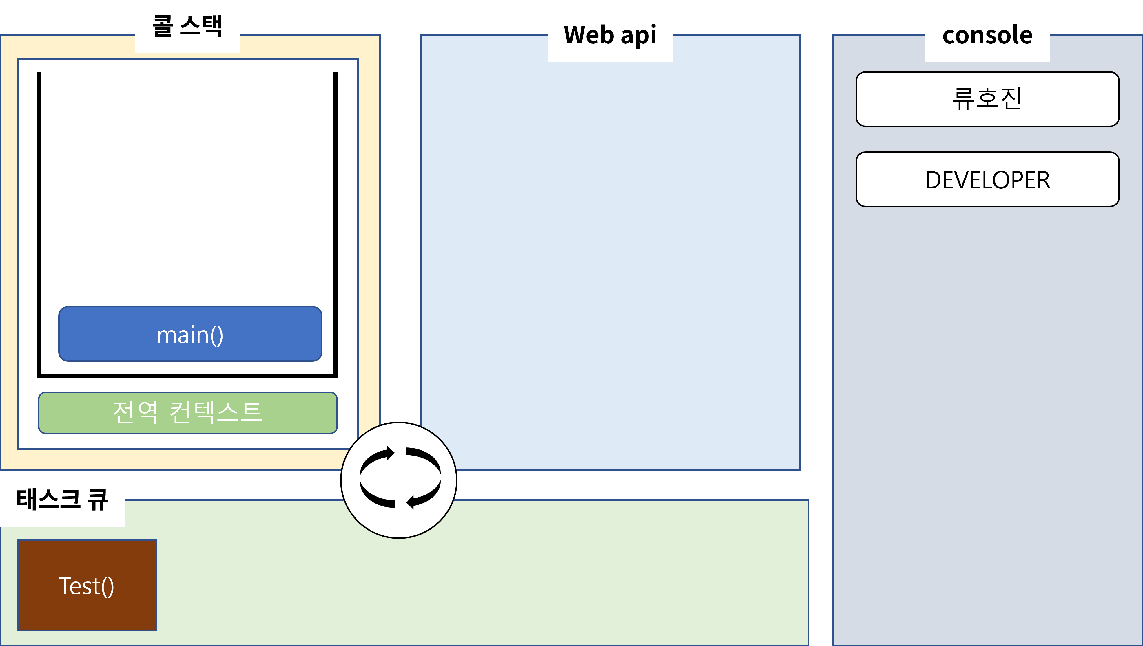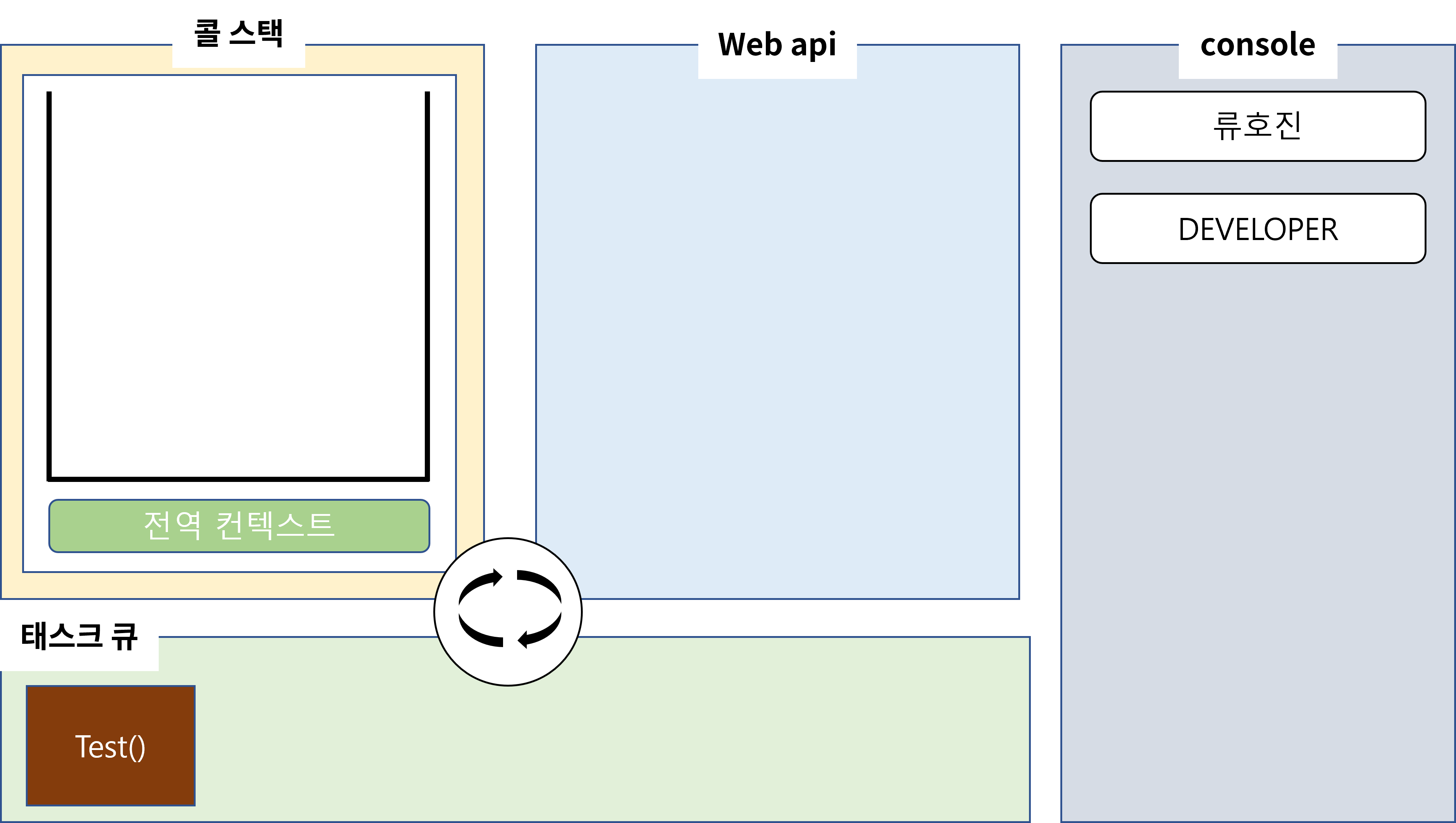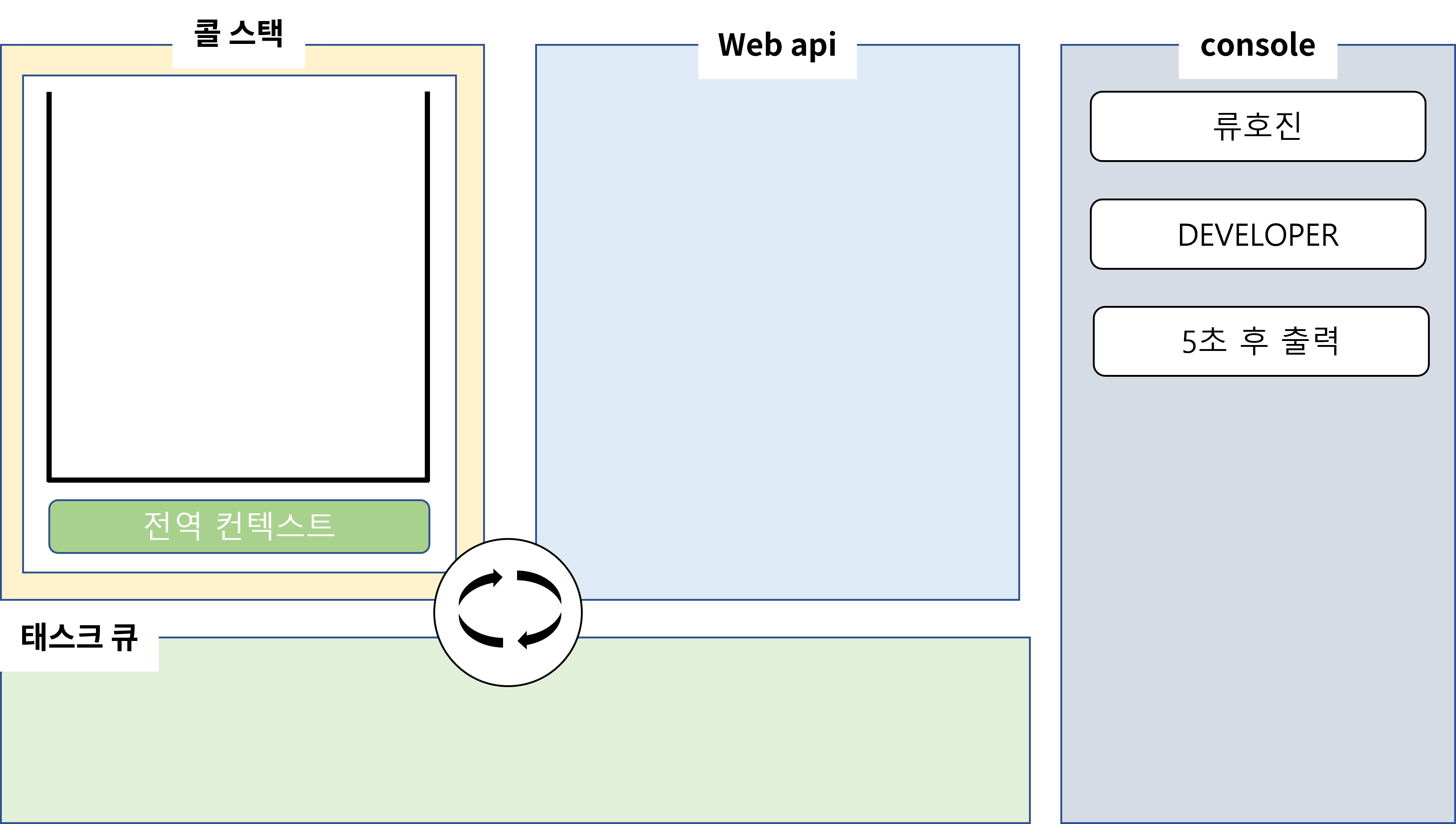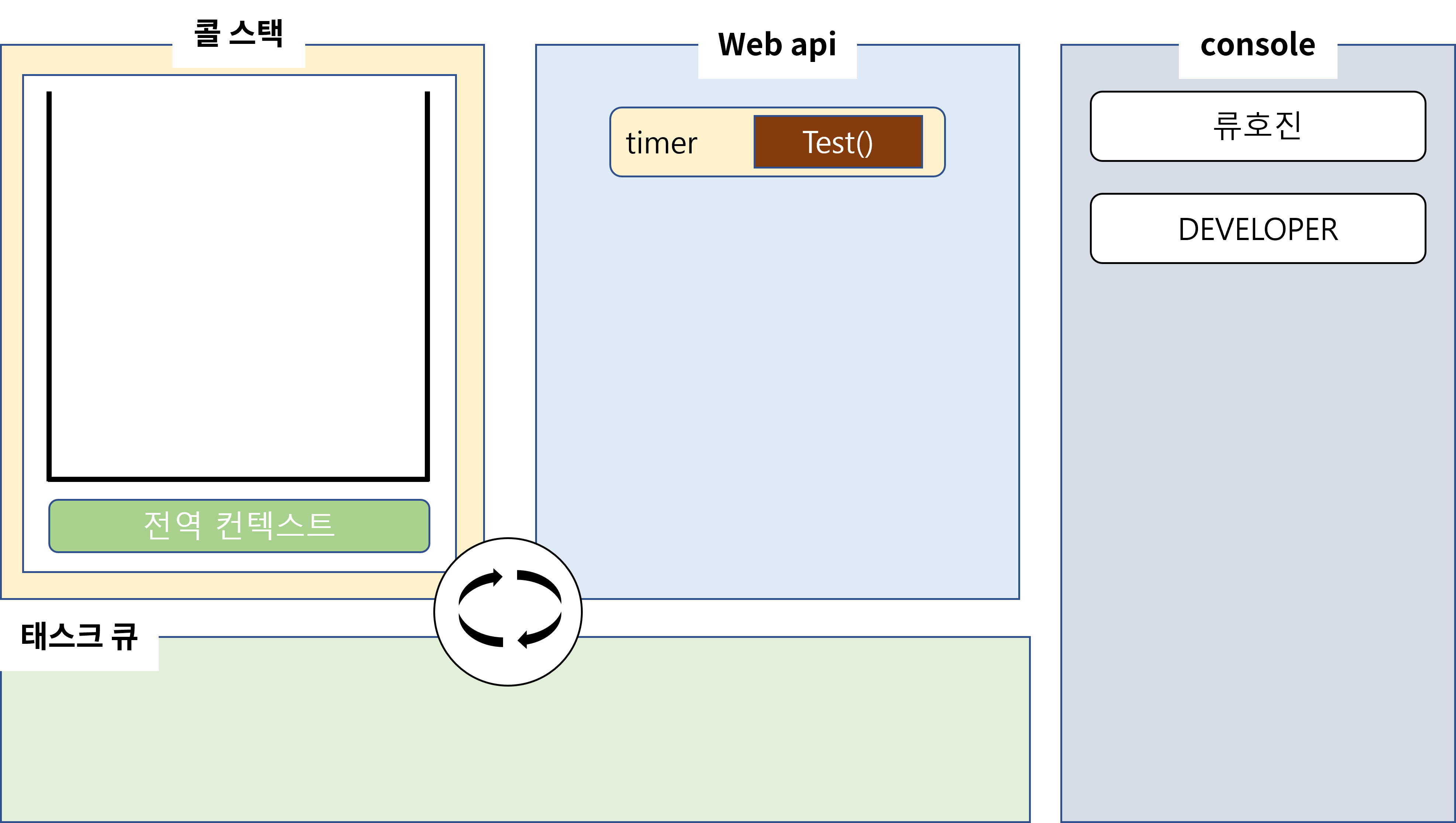 그 다음 류호진을 출력할 때처럼 DEVELOPER를 콜스택에 push하고 pop하면서 console창에 DEVELOPER를 출력하여 줍니다. 그리고 main또한 콜스택에서 pop될 것입니다. 이제 webAPI에서 돌아가고 있는 타이머가 남았습니다. 5초 후에 타이머는 끝이 날 겁니다. 하지만 바로 끝났다고 해서 콜스택에 test를 쌓을 순 없습니다.