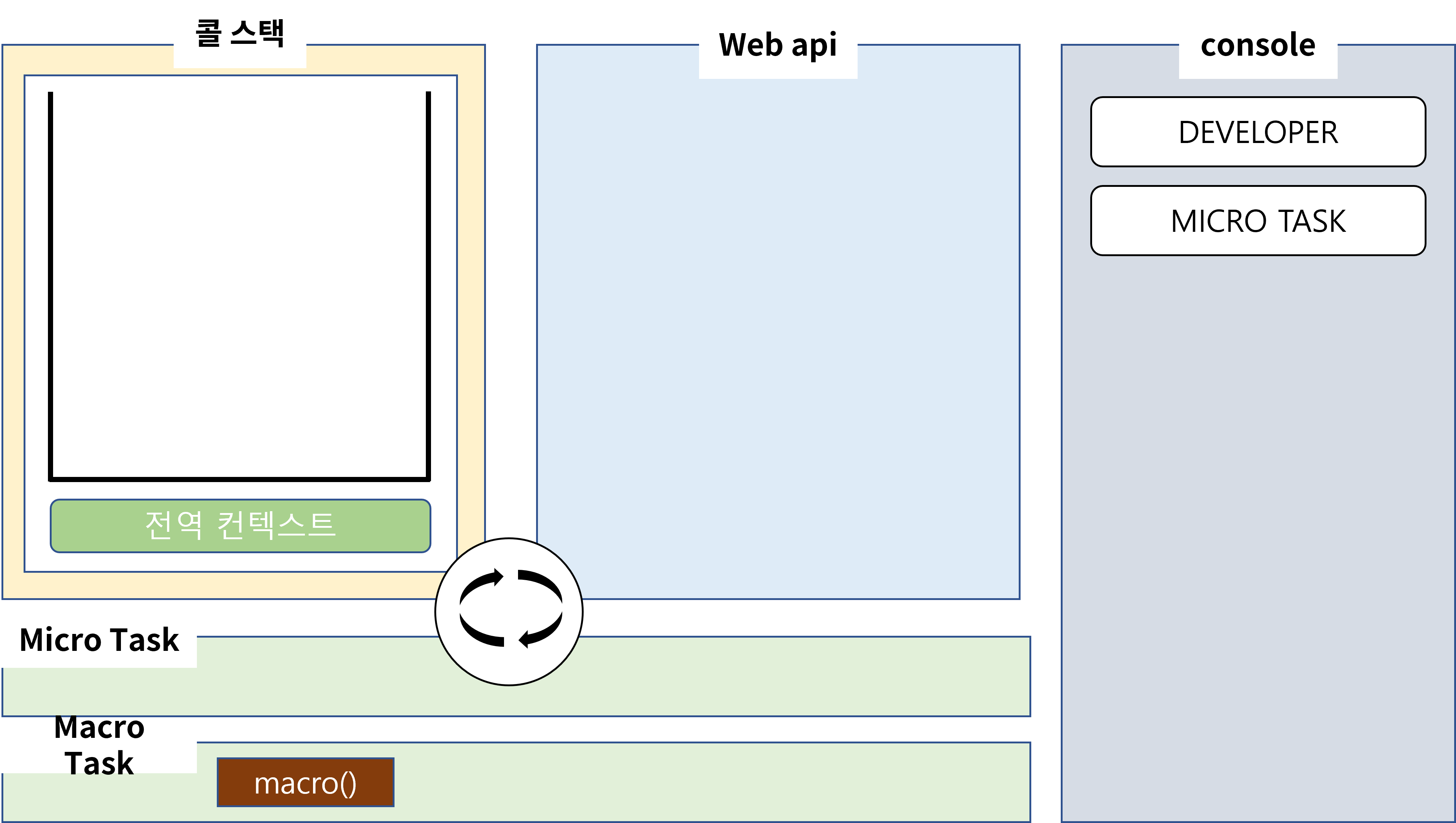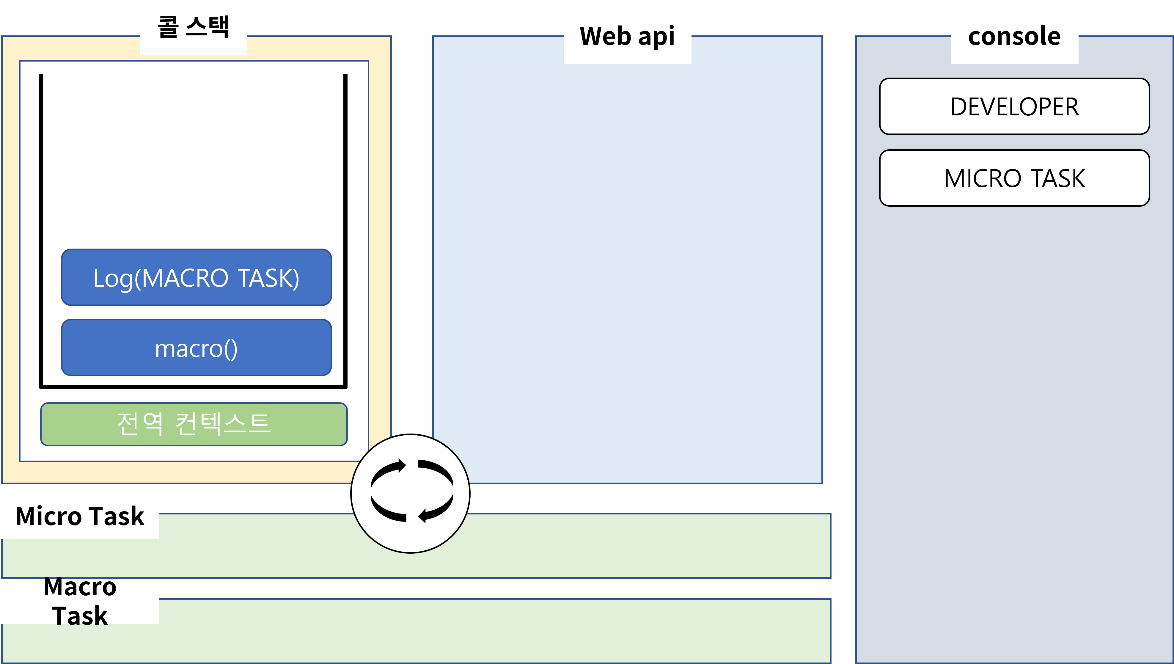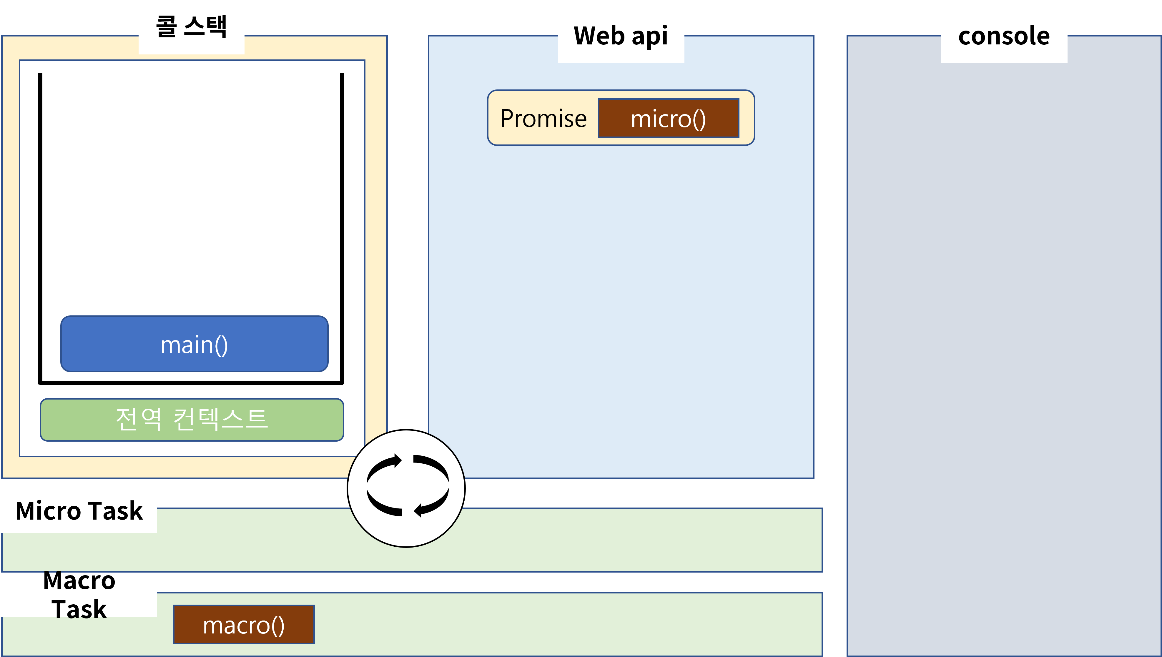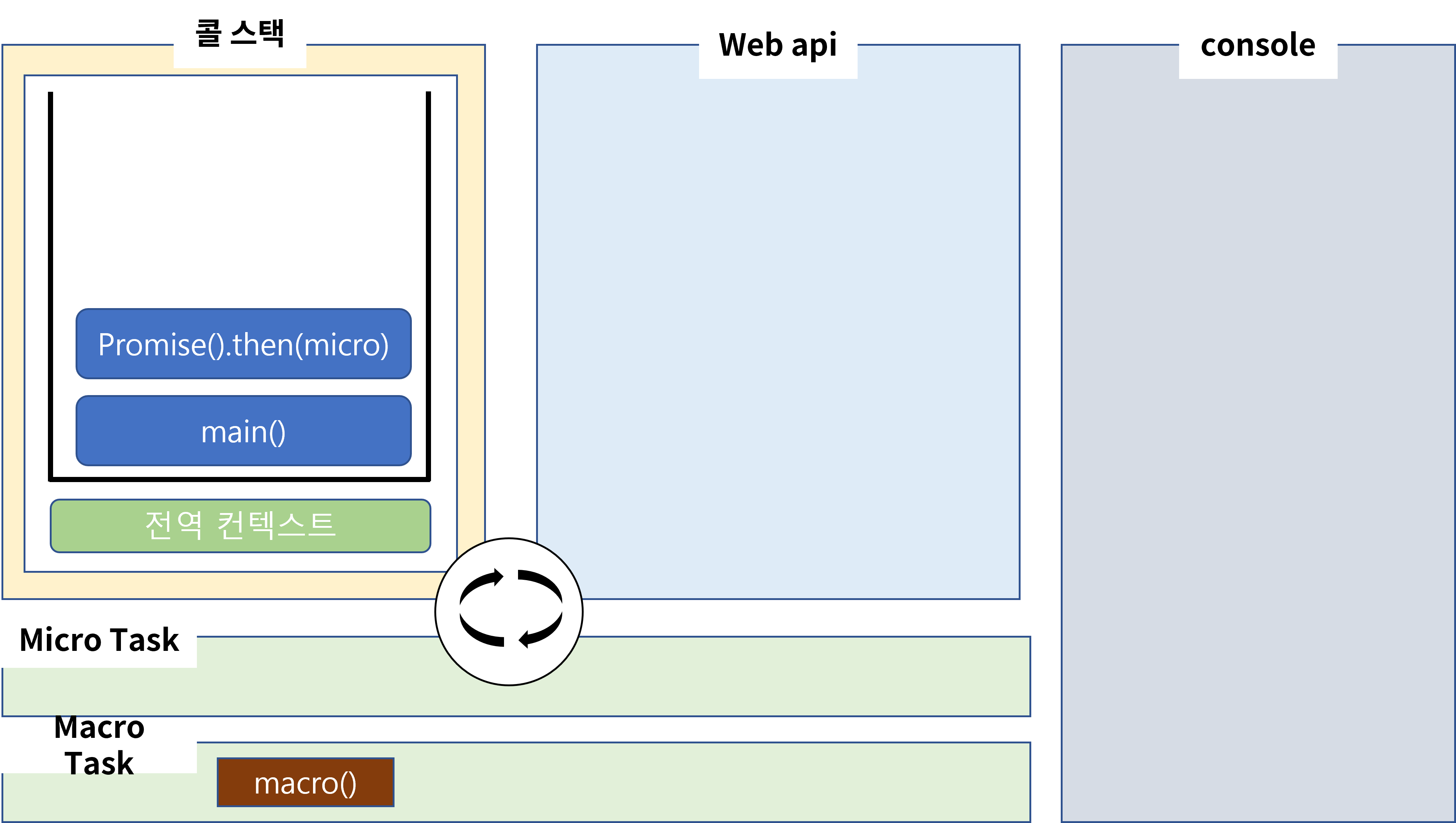 이제 좀 다른 것이 webAPI 내부에서 작업이 끝나면 위의 분류에서 알려드렸듯이 Promise는 MicroTask로 분류가 됩니다. 그럼 작업이 끝나고 콜백이 이렇게 MicroTask에 등록이 되겠죠? 하지만 이벤트 루프는 이번에도 콜스택에 main이 남아 있기 때문에 task의 작업들을 콜스택으로 올릴 수 없습니다.