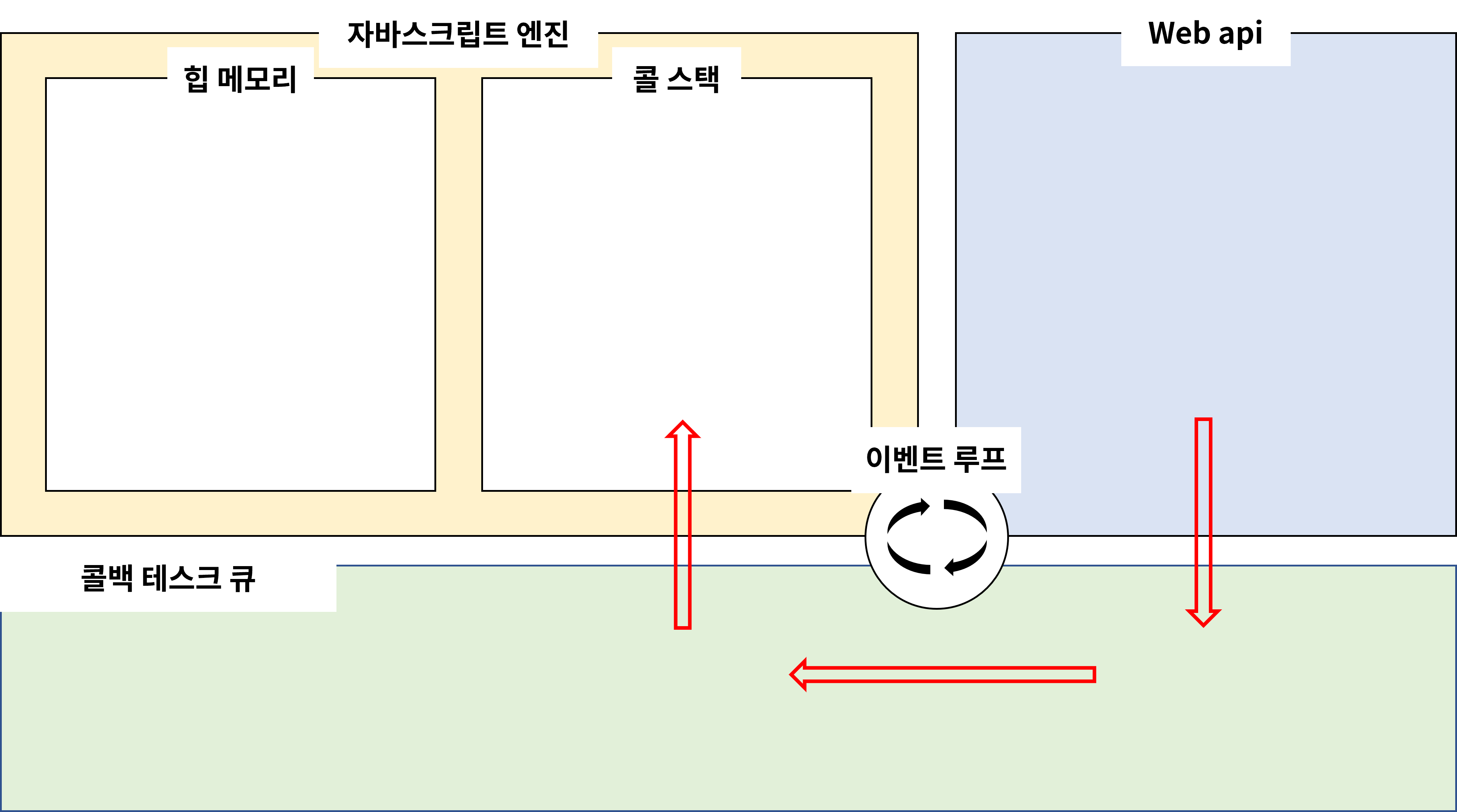 이벤트 루프 설명 위의 그림에서 보이듯 이벤트 루프는 자바스크립트 엔진 내의 개념은 아닙니다. 이벤트 루프의 역할은 쉽게 말해 콜스택과 테스크 큐를 주시하고 있따가 스택이 비워지면 테스크 큐에서 콜백 함수를 꺼내와 콜 스택에 push 시키는 역할을 합니다.